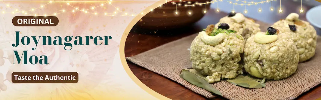 Fresh Joynagar Moa laddoo made with nolen gur, premium winter sweet from Bengal on a festive background.