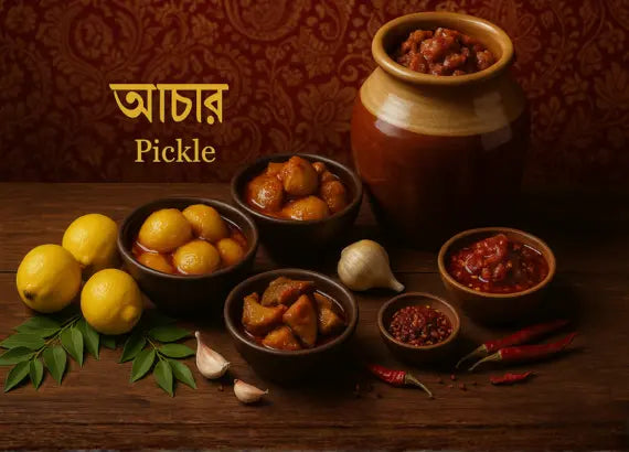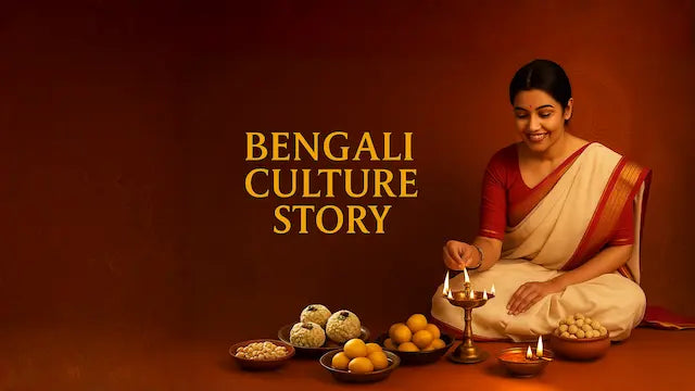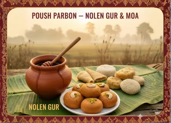 Traditional patali gur date palm jaggery blocks displayed on palm leaf in a festive Bengali background