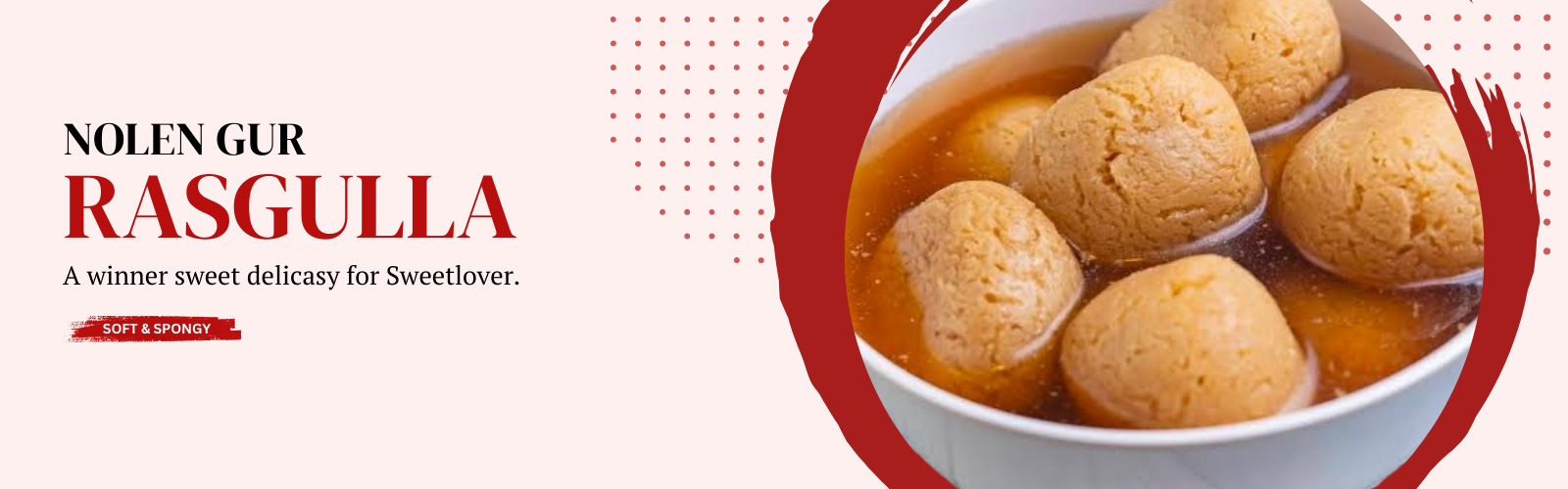 Pure liquid nolen gur khejur gur in bowl, fresh winter date palm jaggery shown on festive Bengali theme.