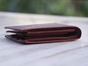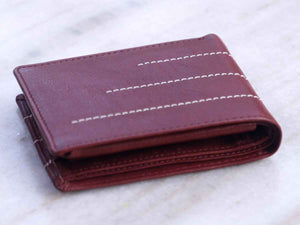 A wallet is a small, flat case used for carrying personal items such as cash, credit cards, ID, and other cards. Wallets can be made of various materials including leather, cloth, plastic, and metal. It is a brown color leather wallet.